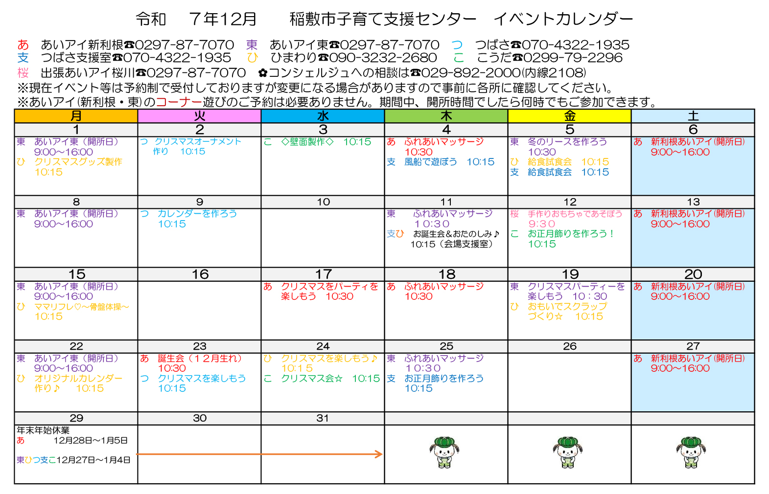 子育て支援センター「あいアイ」を新利根公民館内と「あいアイ東」を東庁舎2階に開設しています。愛にあふれた出会いの場所という意味で愛称を「あいアイ」としました。