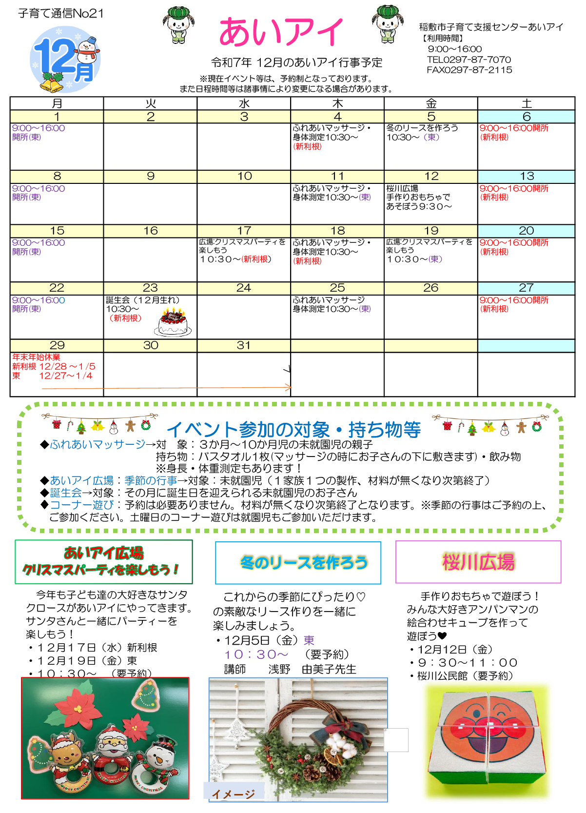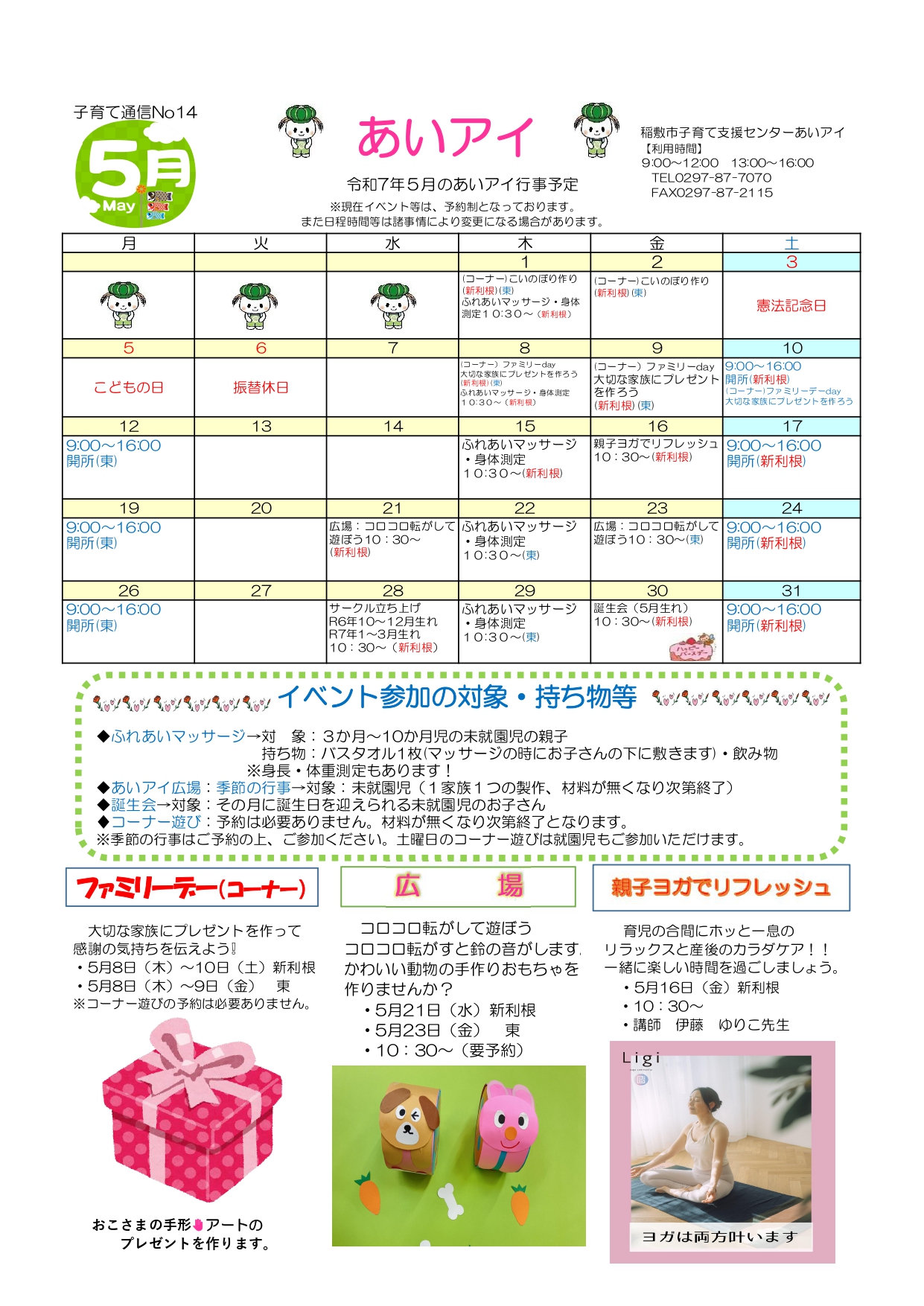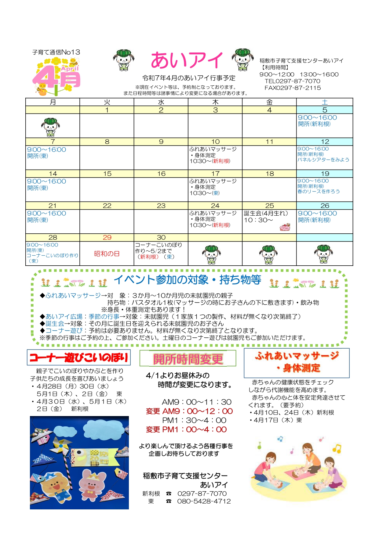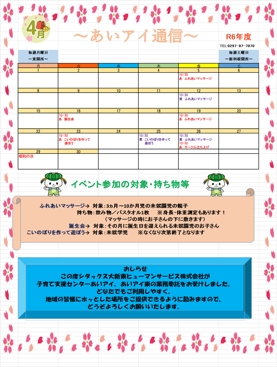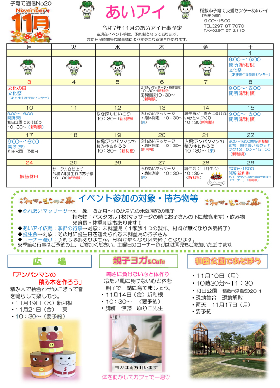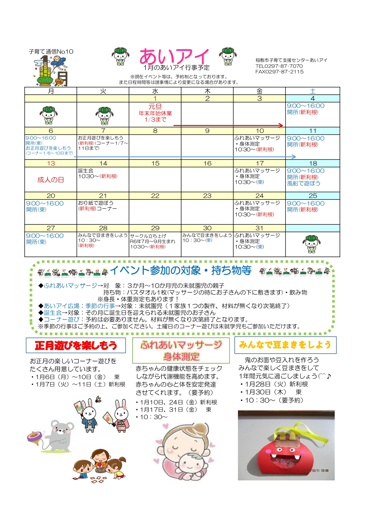 子育て支援センター「あいアイ」を新利根公民館内と「あいアイ東」を東庁舎2階に開設しています。愛にあふれた出会いの場所という意味で愛称を「あいアイ」としました。