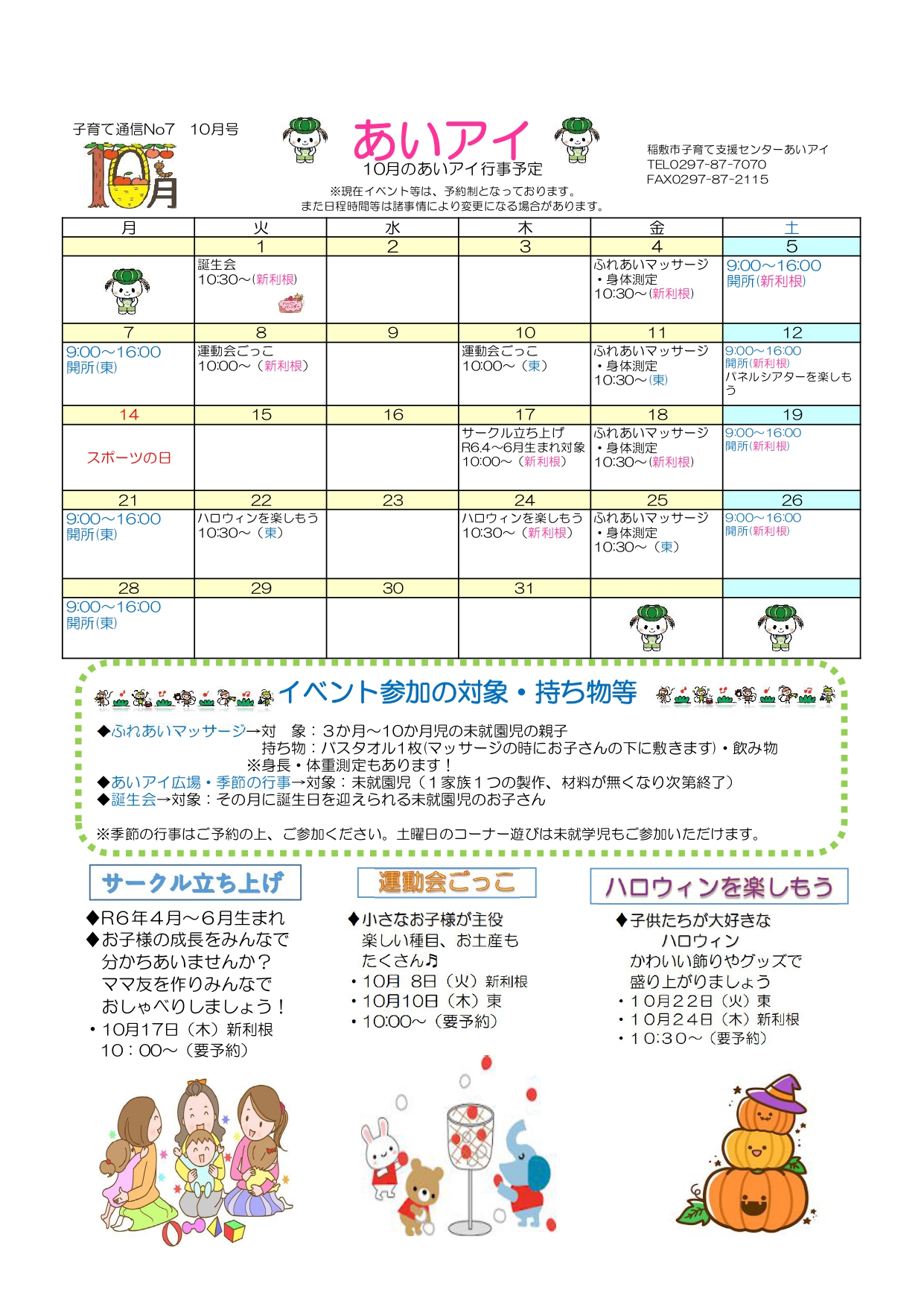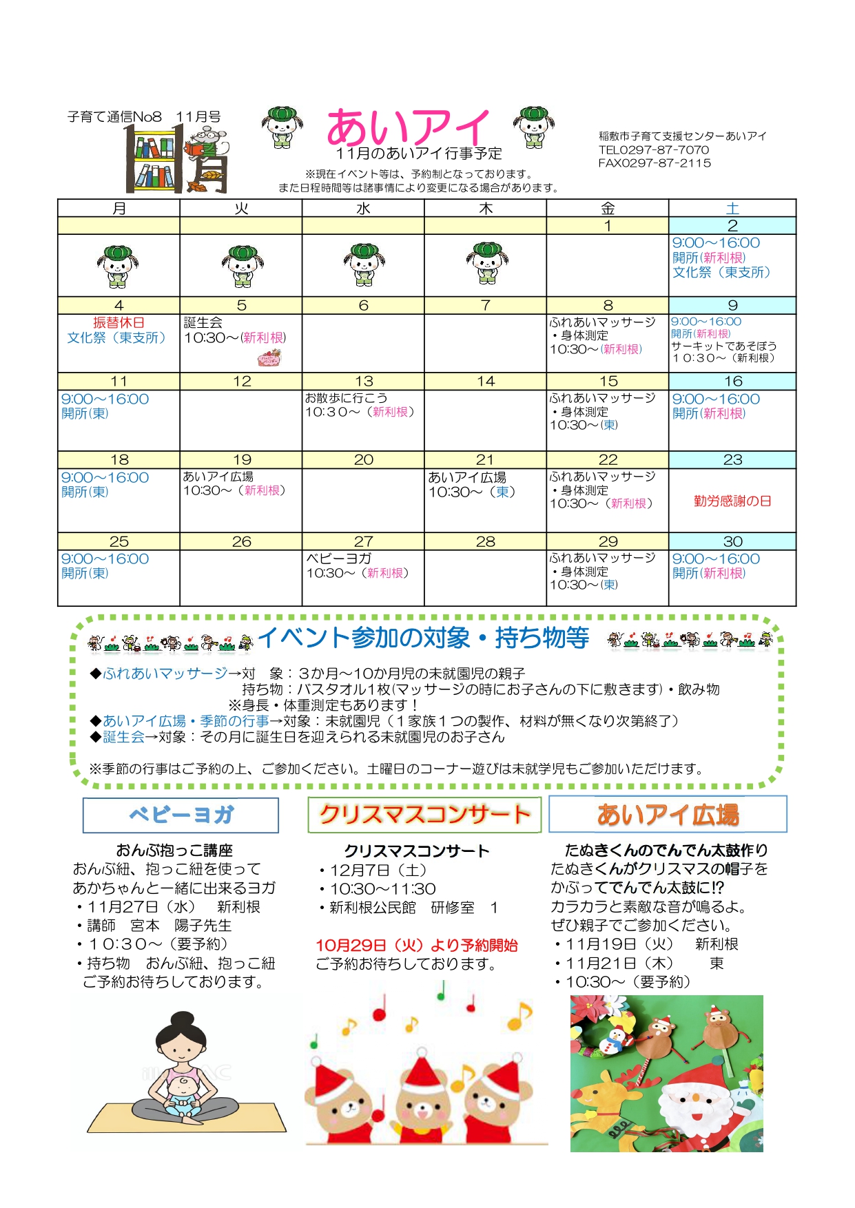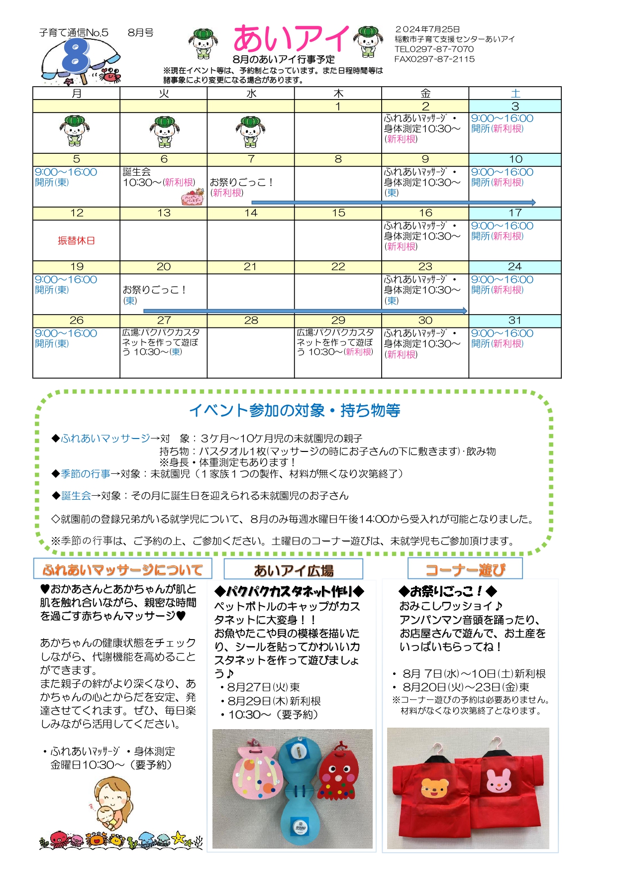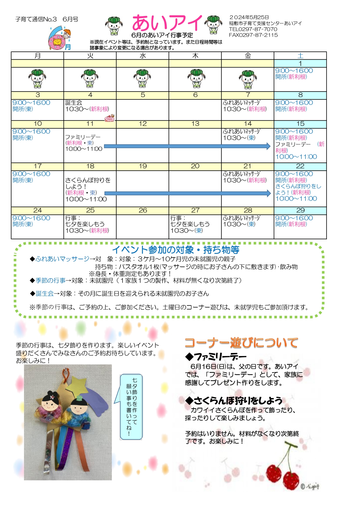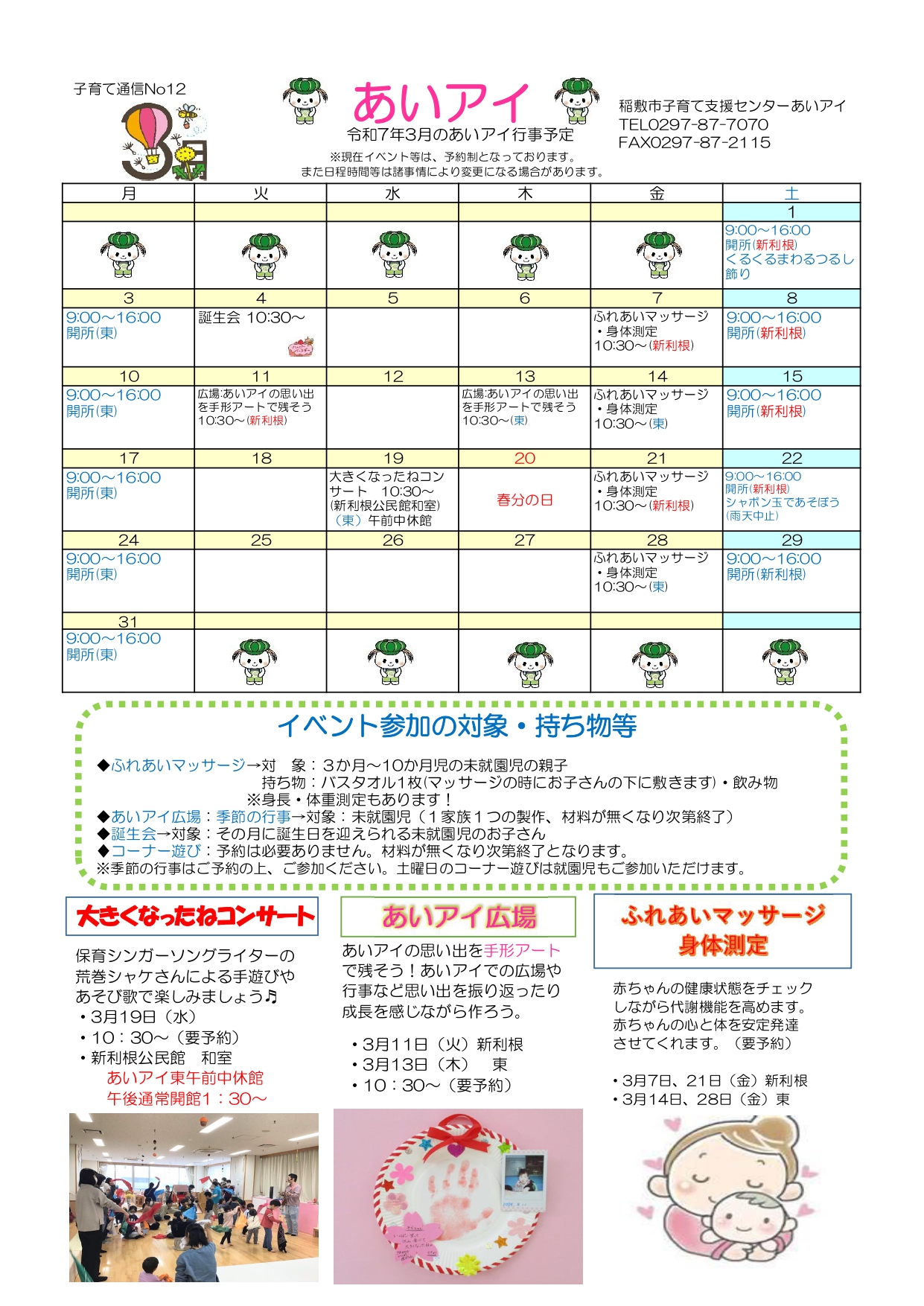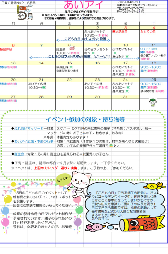 子育て支援センター「あいアイ」を新利根公民館内と「あいアイ東」を東庁舎2階に開設しています。愛にあふれた出会いの場所という意味で愛称を「あいアイ」としました。