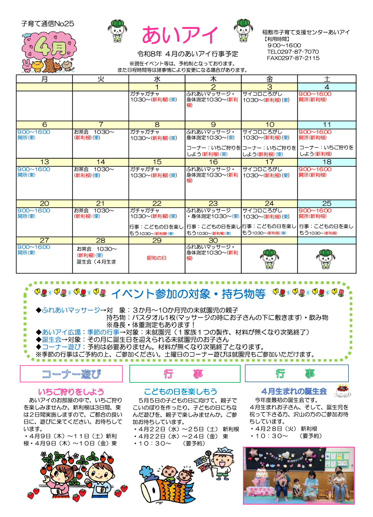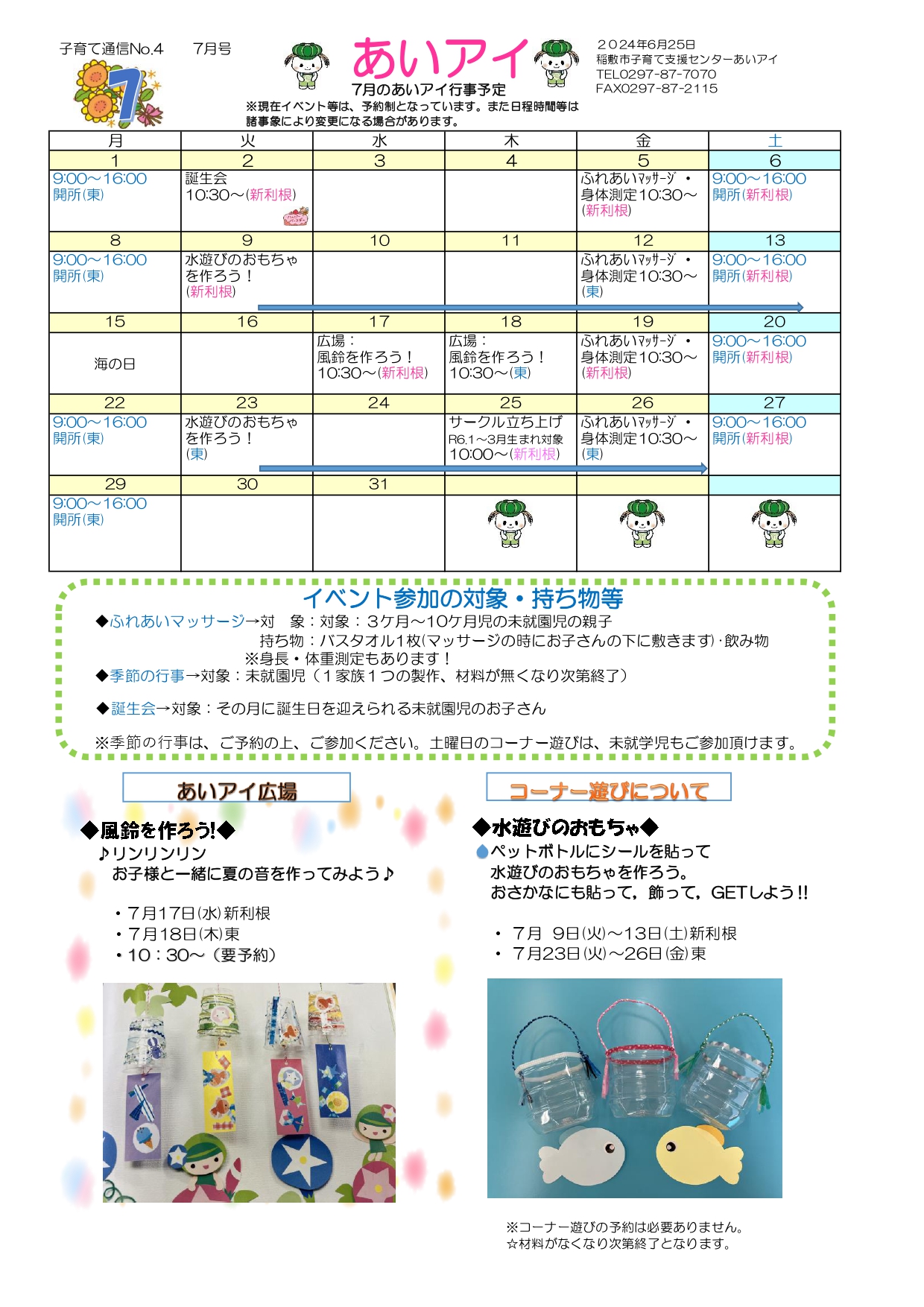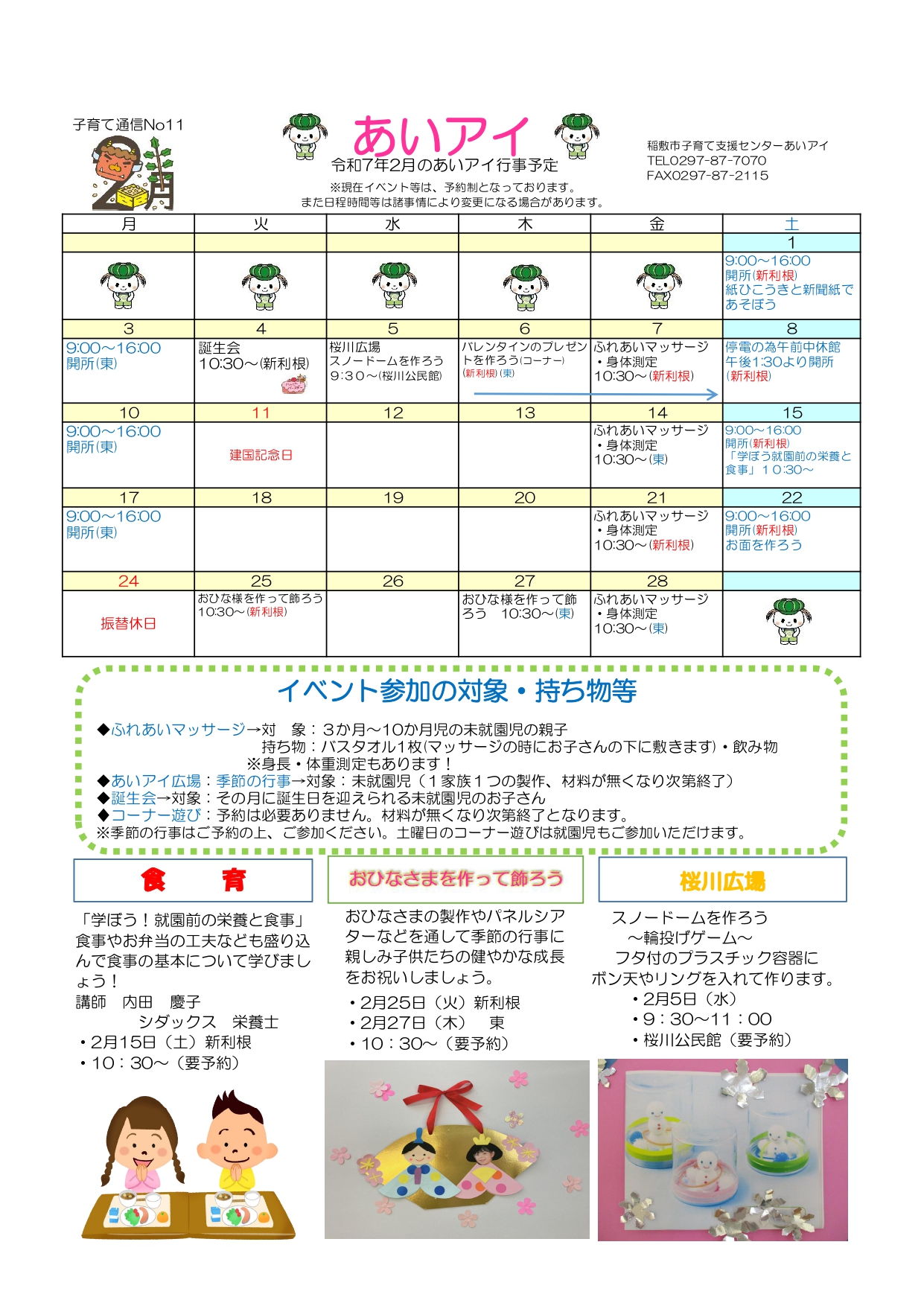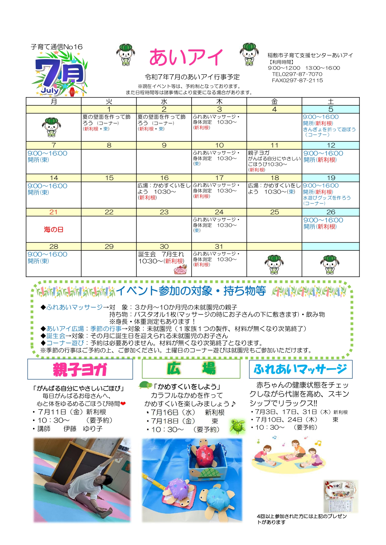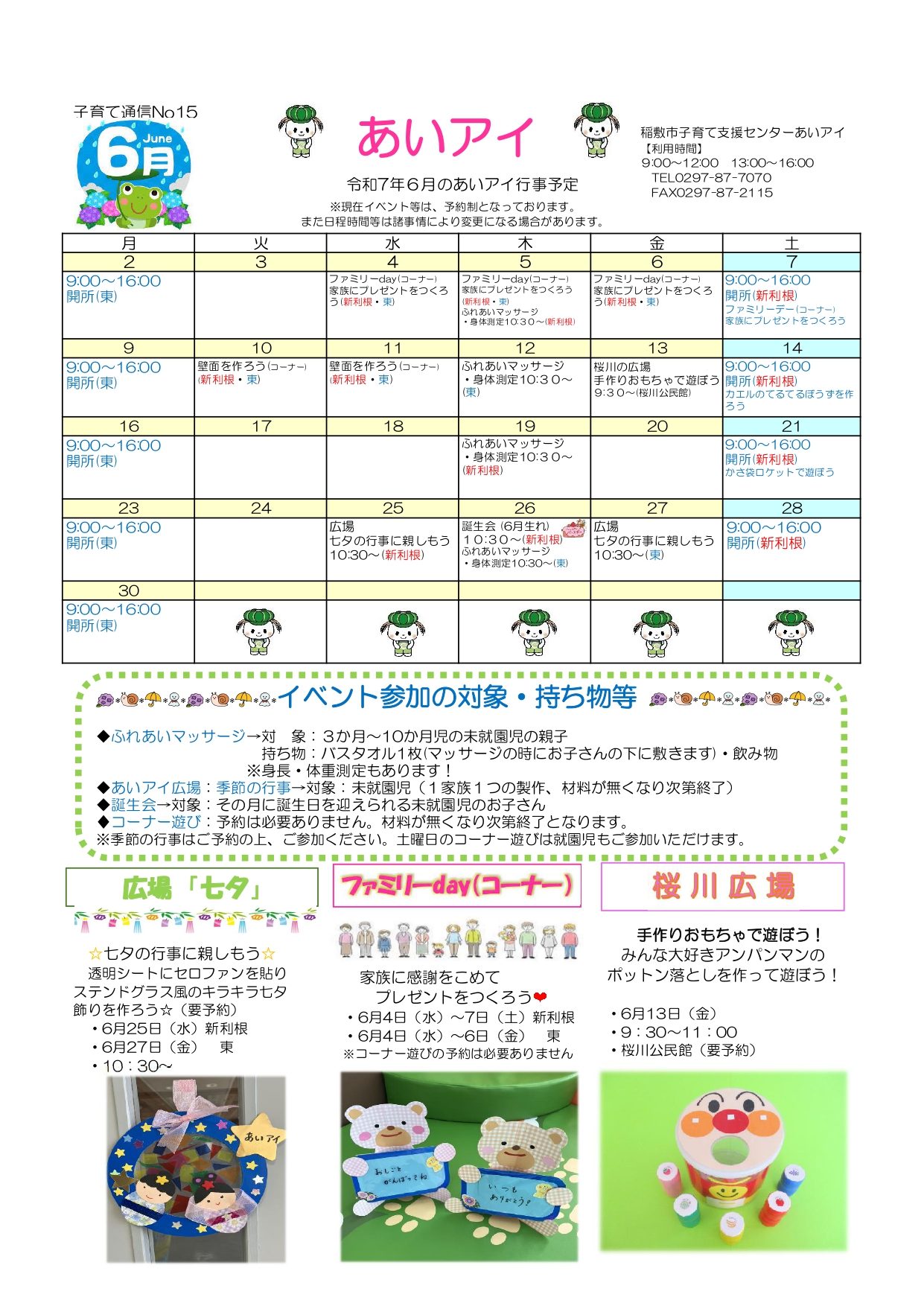 子育て支援センター「あいアイ」を新利根公民館内と「あいアイ東」を東庁舎2階に開設しています。愛にあふれた出会いの場所という意味で愛称を「あいアイ」としました。
