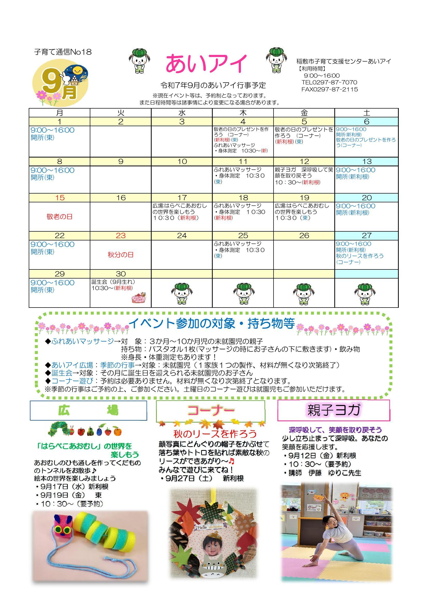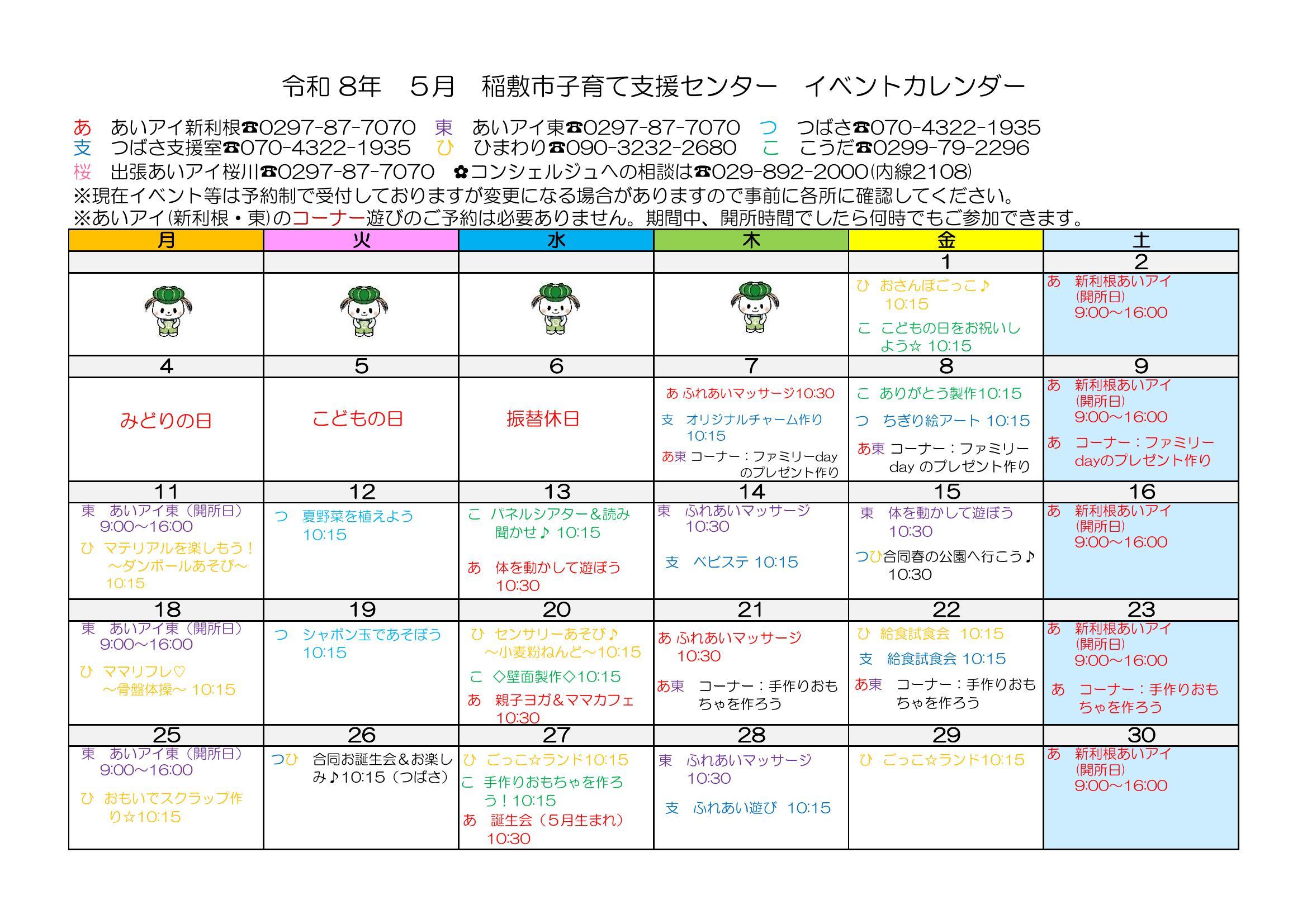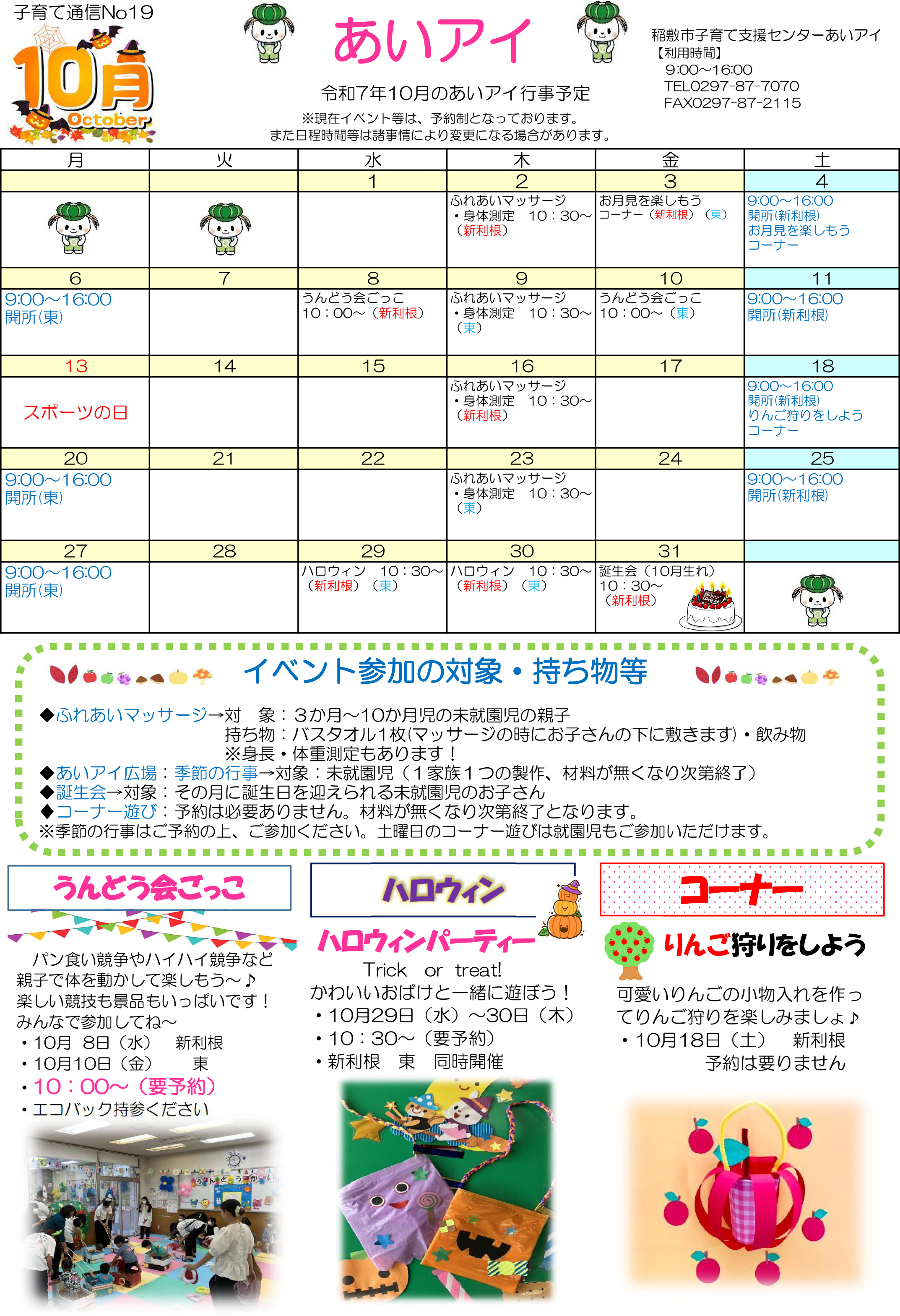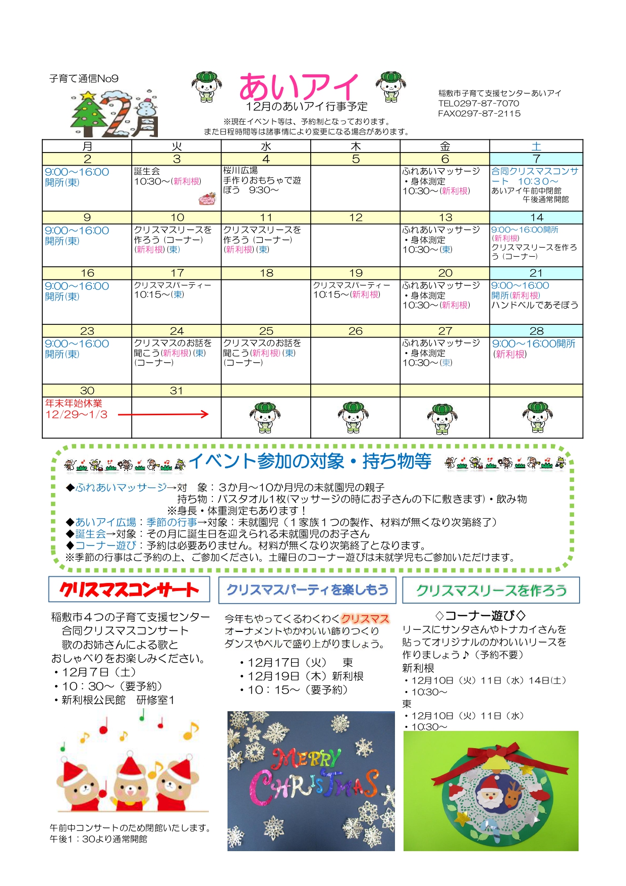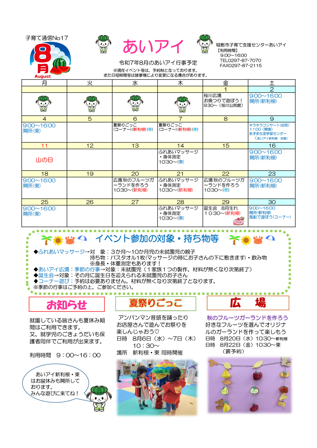 子育て支援センター「あいアイ」を新利根公民館内と「あいアイ東」を東庁舎2階に開設しています。愛にあふれた出会いの場所という意味で愛称を「あいアイ」としました。